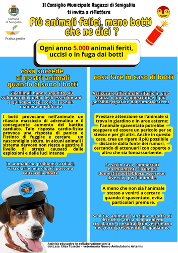Il Consiglio Municipale Ragazzi della città di Senigallia, nella sua edizione 2024-2025 conclusasi a giugno, proposto e realizzato, tra le altre cose, una campagna di sensibilizzazione per l’uso consapevole e limitato dei botti, con particolare attenzione agli effetti che questi hanno sugli animali.